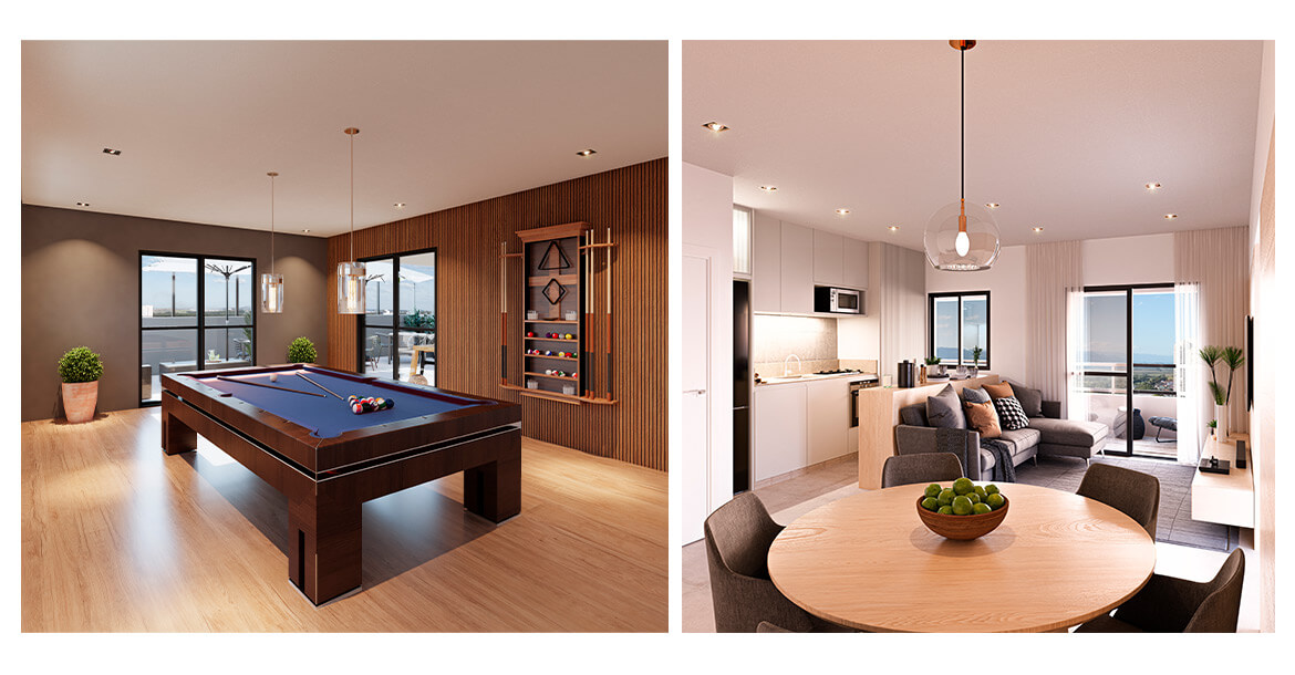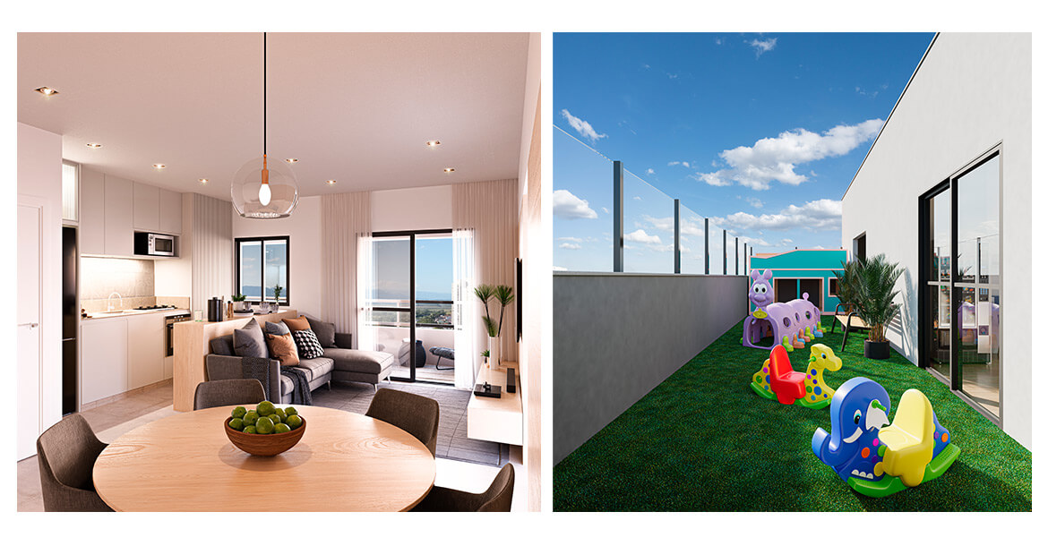 Serão apartamentos de 2 dormitórios, sendo 1 suíte, com plantas de 63,99 m² e 66,81 m², todos com ampla varanda gourmet para aproveitar bons momentos em família e com amigos.
